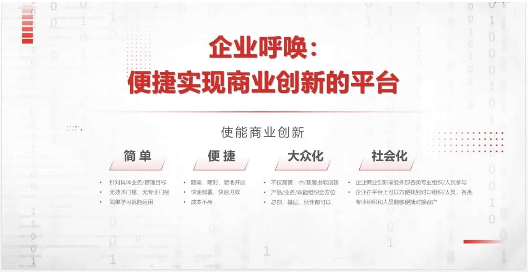 企业推进基于数智化的商业创新,需要移除技术、商业和成本“三座大山”,呼唤能够便捷实现商业创新的平台,使能商业创新简单、便捷、大众化、社会化。