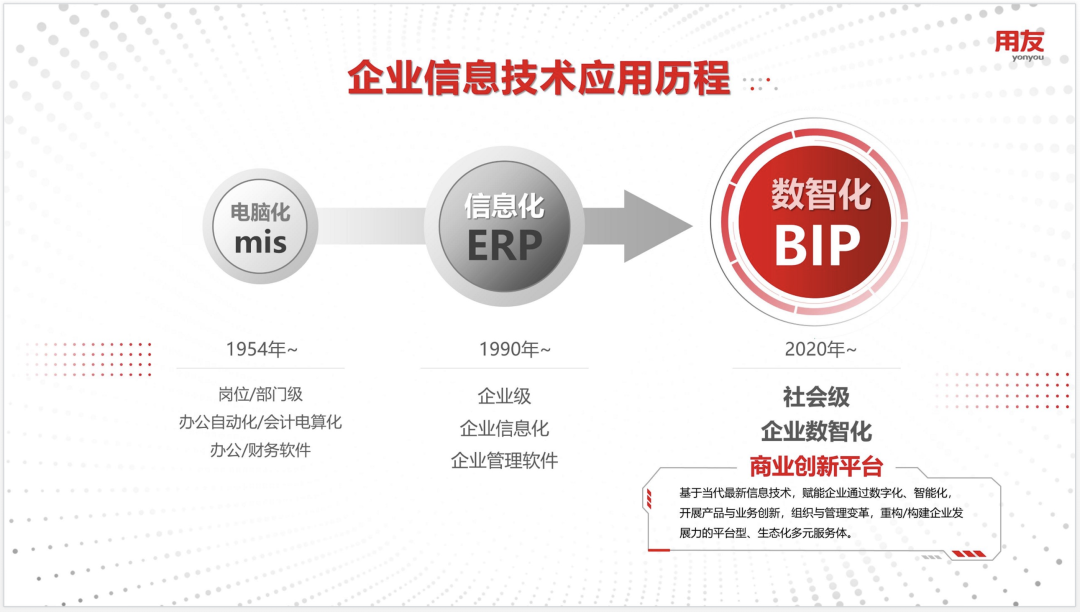 信息技术在企业的应用从以ERP(企业资源计划)为代表的,以“流程优化,提高效率“为核心价值的企业信息化阶段,跨入以BIP(商业创新平台)为代表,以“商业创新,重构发展力”为核心价值的企业数智化的全新阶段。