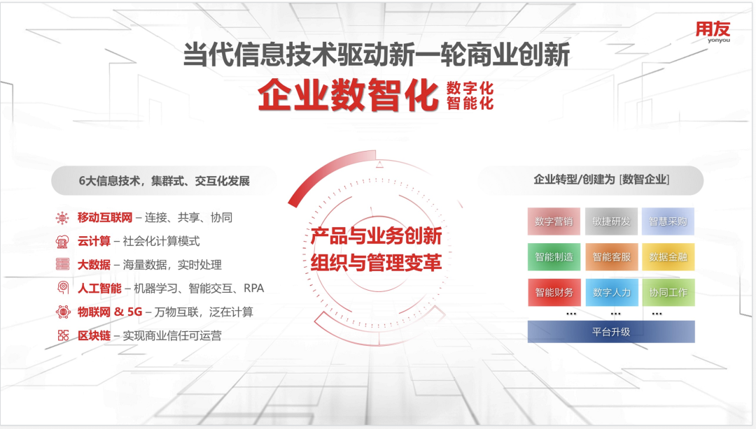 “用创想与技术推动商业和社会进步”是用友遵从多年的使命,这一使命一直指引着用友在不同时期的创新发展。在经历了以用友财务软件服务企业会计电算化,以用友ERP(企业管理软件)服务企业信息化之后,用友进入3.0时期。站在持续专注以信息技术服务企业创新发展30年的基础上,用友战略投资研发推出了全新一代产品:用友商业创新平台(YonBIP)。构建和运营全球领先的商业创新平台,让企业客户“商业创新,如此便捷”,是用友在新时期对公司使命的具体践行。用友商业创新平台YonBIP定位为数智商业应用基础设施、企业服务产业共创平台,具有数字化、智能化、高弹性、安全可信、社会化、全球化、平台化、生态化八大特性,将支撑和运行企业和公共组织的商业创新,让商业创新如此便捷。