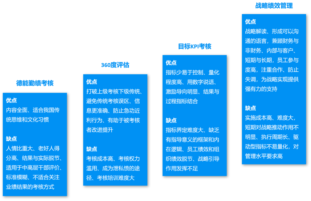 在中国企业内部,上述四种绩效考核方式都有其存在的空间,处于不同发展阶段的企业采用不同的绩效管理手段,总的来说,基于战略实施和经营业绩提升的战略绩效管理已经成为主流。