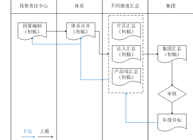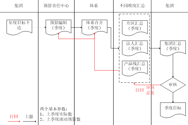而季度滚动预算是一个“自下而上”的汇总过程,先由各预算责任编制季度滚动预算,再经过层层汇总生成集团年度目标,管理层对汇总数据进行审批和打回动作: