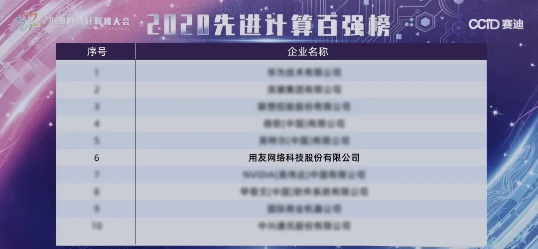 11月3日,在长沙举行的2020世界计算机大会发布“2020中国先进计算百强榜总榜单”。用友网络科技股份有限公司(以下简称“用友”)紧随华为、浪潮、联想、微软、英特尔,位居百强榜单第六位。