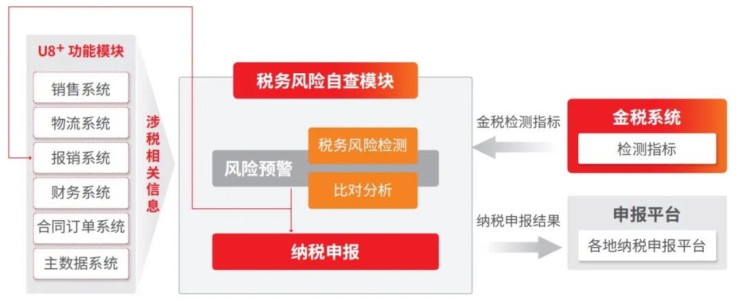 连接融合 U8+、税务云,实现“云 + 端”税务风险管控的一体化应用, 实现基于企业纳税申报表的税务风险预警、纳税申报表比对分析。