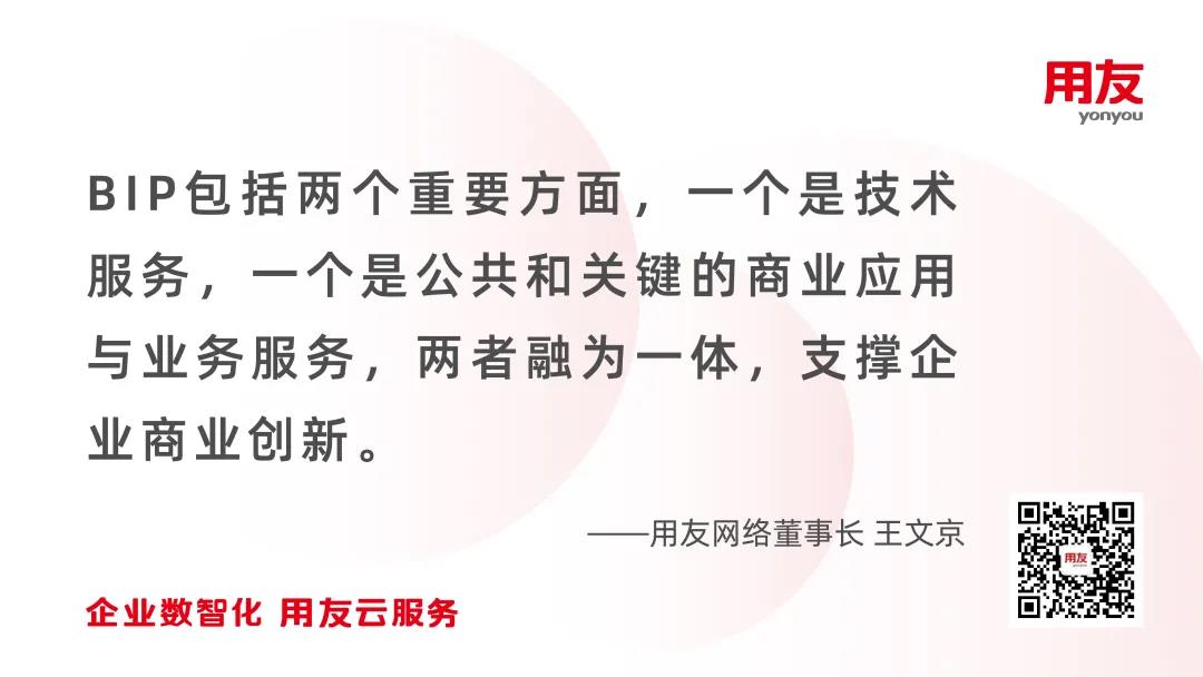 作为中国企业服务龙头的掌舵人,王文京对BIP的定义是“利用新一代数智化技术,实现企业产品与业务创新、组织与管理变革的综合服务平台。”他指出,BIP包括两个重要方面,一个是技术服务,一个是公共和关键的商业应用与业务服务,两者融为一体,支撑企业商业创新。平台上的企业、相关组织与个人可以随需、随时、随地开展商业创新,使商业创新突破三大屏障,同时BIP采用新一代IT架构,降低了企业IT的部署、应用和运行成本,使商业创新变得简单、便捷、大众化、社会化。