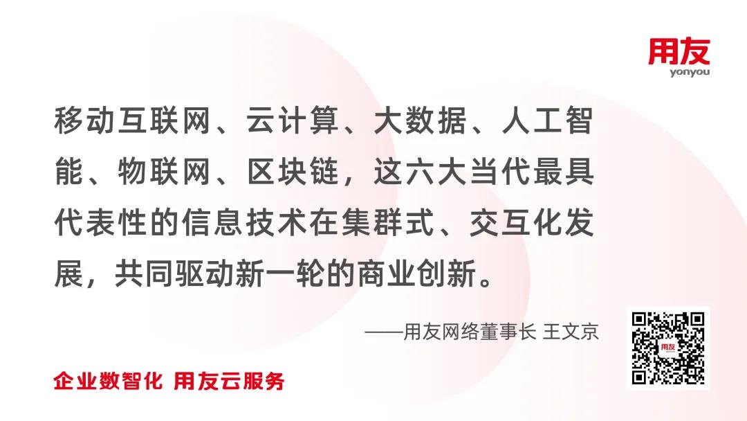 12月23日,用友网络董事长王文京出席2020年崇礼论坛并作主题演讲。在题为“当代信息技术驱动的新一轮商业创新”的主旨演讲中,王文京指出,移动互联网、云计算、大数据、人工智能、物联网、区块链,这六大当代最具代表性的信息技术正在集群式、交互化发展,共同驱动新一轮的商业创新,即企业数智化,包括了数字化和智能化。