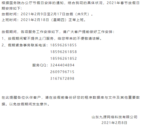 山东九源关于2021年春节放假通知