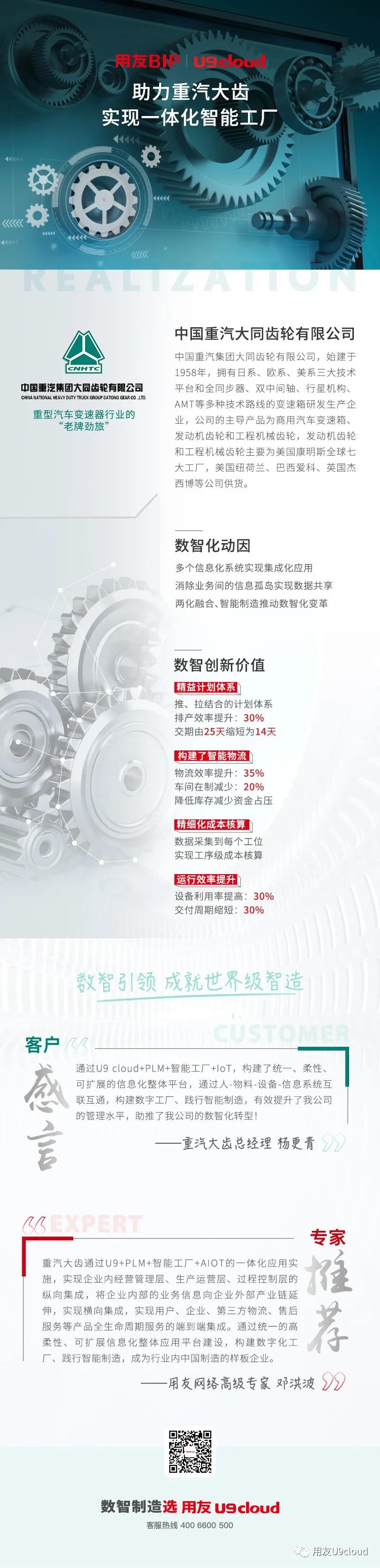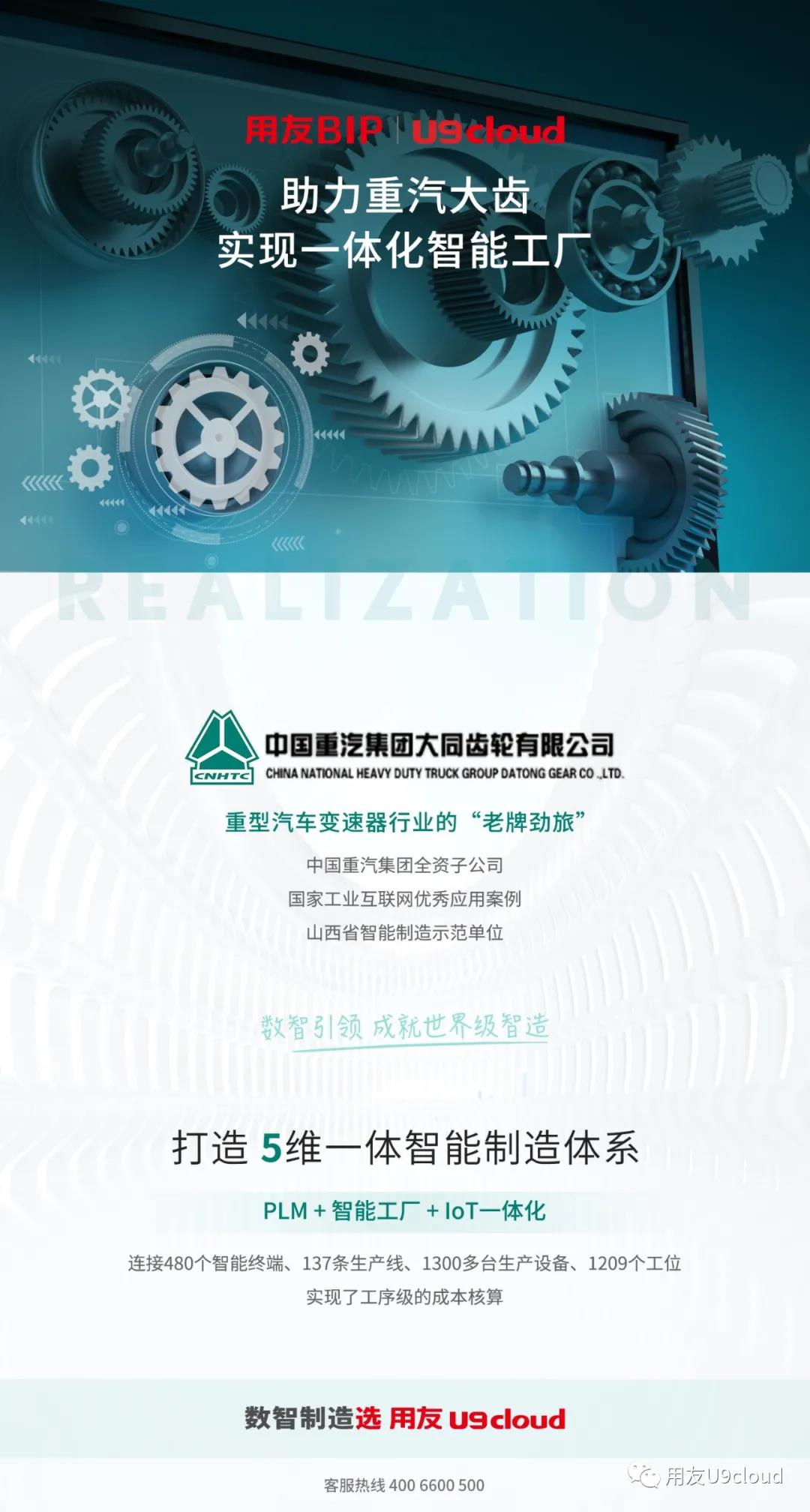 重汽大齿总经理 杨更青:“通过U9 cloud+PLM+智能工厂+IoT,构建了统一、柔性、可扩展的信息化整体平台,通过人-物料-设备-信息系统互联互通,构建数字工厂、践行智能制造,有效提升了我公司的管理水平,助推了我公司的数智化转型!”