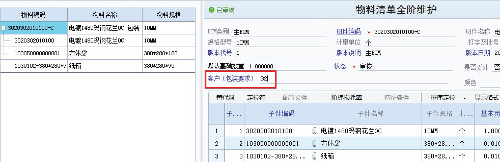 客户包装要求的结构性自由项的使用,达到同一存货针对不同客户不同的BOM来实现,不用加存货编码同时实现管理要求
