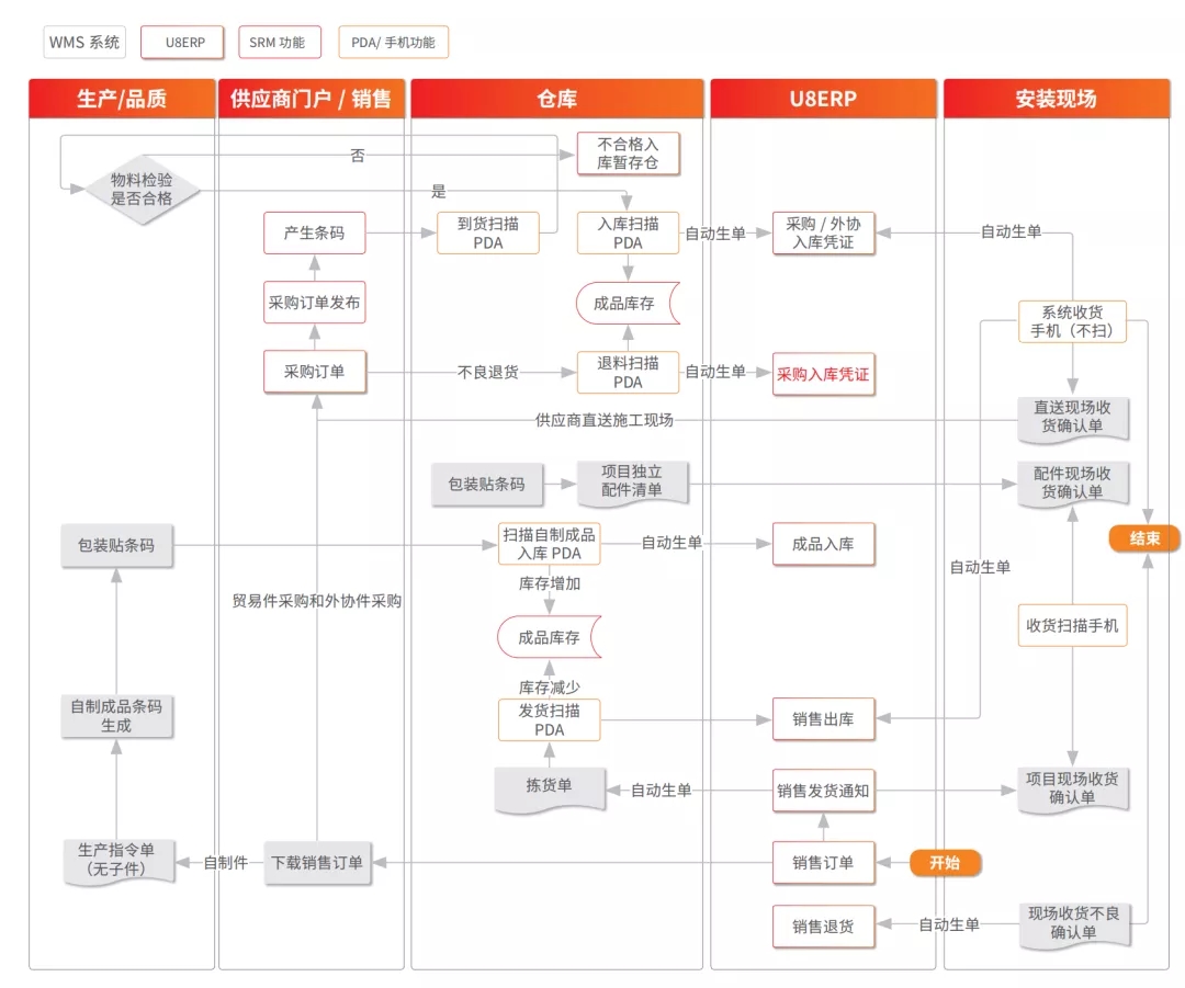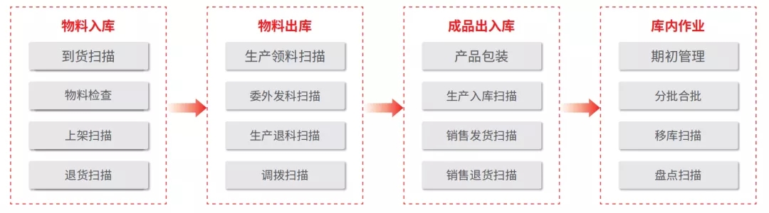 • WMS条码管理作为承上启下部分,进一步把来料出入库,物料出入库、成品出入库紧密串联起来,完善了条码的精细化管理;