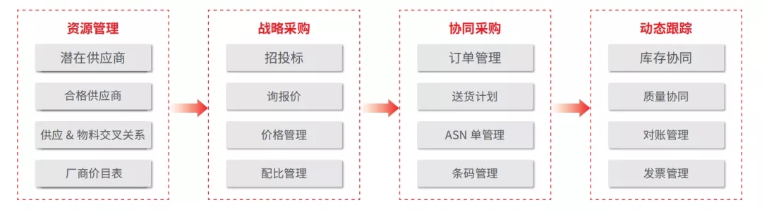 • SRM内搭建供应商门户平台,提供资源管理、战略采购、协同采购、动态跟踪模块应用;
