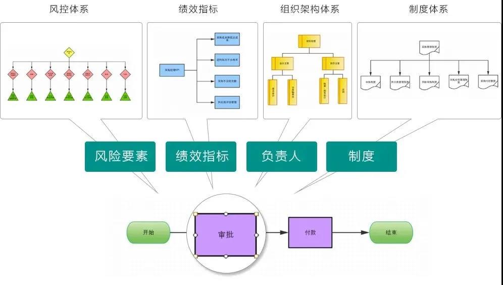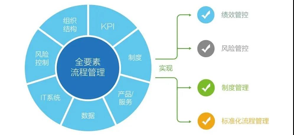 基于流程,关联职责、制度、风控、绩效指标等管理要素,使企业各项管理要求能够有效落实到每一支流程、每一个环节的执行过程中,从而真正实现企业精细化管理,统一流程梳理和流程执行管控标准及流程引用。