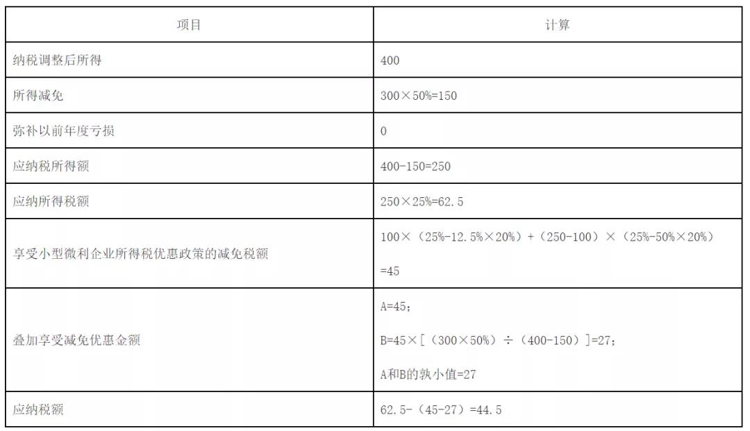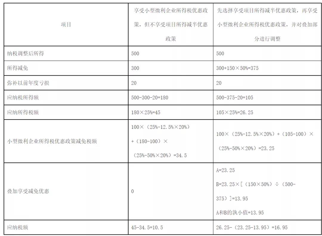 下面,以小型微利企业为例说明叠加享受减免税优惠的计算方法。企业选择享受其他减免所得税优惠政策,可据此类推。