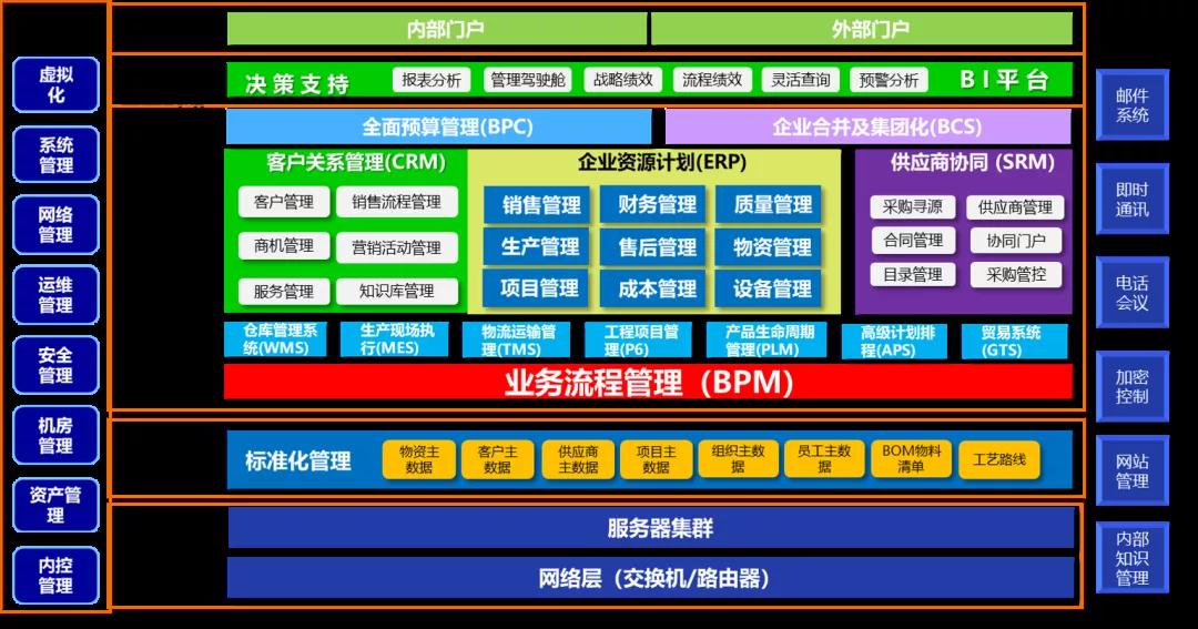 BPM打通信息系统架构中的数据层、服务层、流程层、应用层、展现层,实现各系统间的深度集成。