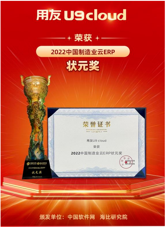 近日,海比研究院、中国软件网联合中国软件行业协会应用软件产品云服务分会在北京举行《2022 中国智能制造软件市场研究及选型评估报告》发布论坛。会上,用友U9 cloud荣获“2022中国制造业云ERP状元奖”,这是继2021年用友U9 cloud荣获制造业云ERP云第一名之后又一次斩获该类殊荣。