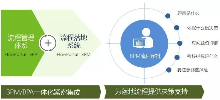 FlowPortal BPM同时提供流程知识库与流程落地系统,流程知识库告诉员工正确的做事方式,流程手册、岗位手册,告诉员工应做的事情,做事情时应遵守的管理要求。流程落地系统将做事过程、做事方法、做事要求固化到IT系统,提升企业执行力,两者紧密集成,全面帮助企业打造知识型、高效率组织。