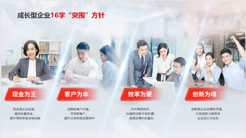 面对越来越多的不确定性,用友为成长型企业开出了一张只有16个字的“突围”良方,即现金为王、客户为本、效率为要、创新为魂。而这背后更深层次的含义是要打造企业“韧性”,因为“韧性”是帮助成长型企业化危为机的重要能力,而数智化是应对不确定性最有效的举措。只有基于数智化强化企业韧性,才能更好的跨越危机,实现高效增长。