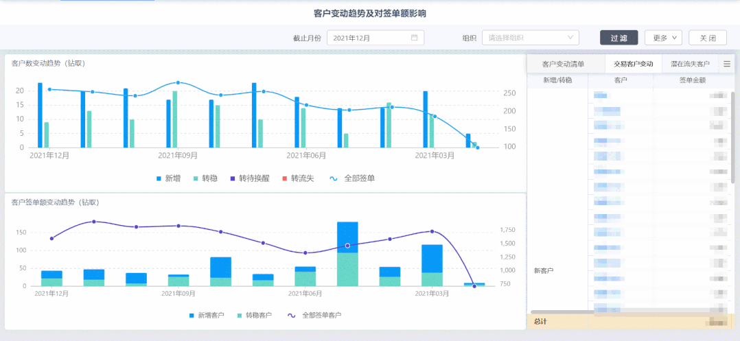 科讯重视客户关系管理,系统中预置了系列客户经营分析报表,基于客户特征和行为标签管理,签单客户变动、客户签单贡献、大客户交易行为等分析,为科讯建立客户分析体系提供了有效参考,大大降低报表开发成本。