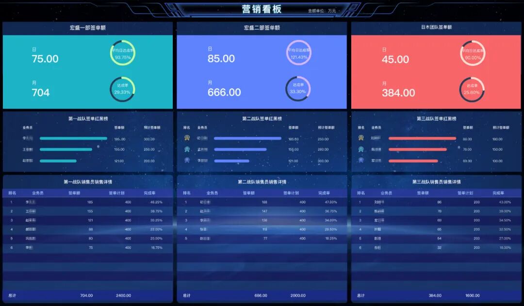 大屏中,业绩目标达成进度,有效分析业绩目标和差距,帮助销售及时调整;销售达成签单业绩红黑榜,对各部门销售人员进行业绩排名,对排名前三的人员进行展现和表彰,改变了以往只能自己在系统中查看统计式排名、无进一步分析的局面,形成有效激励;部门间销售人员自动排名评比,公开、透明,激发潜能,实现各团队、业务人员之间形成良性竞争;业绩看板跑马灯,实现新签订单的实时展现,形成比学赶帮超的局面,充分展现 “团结合作、拼搏超越”的科讯精神。