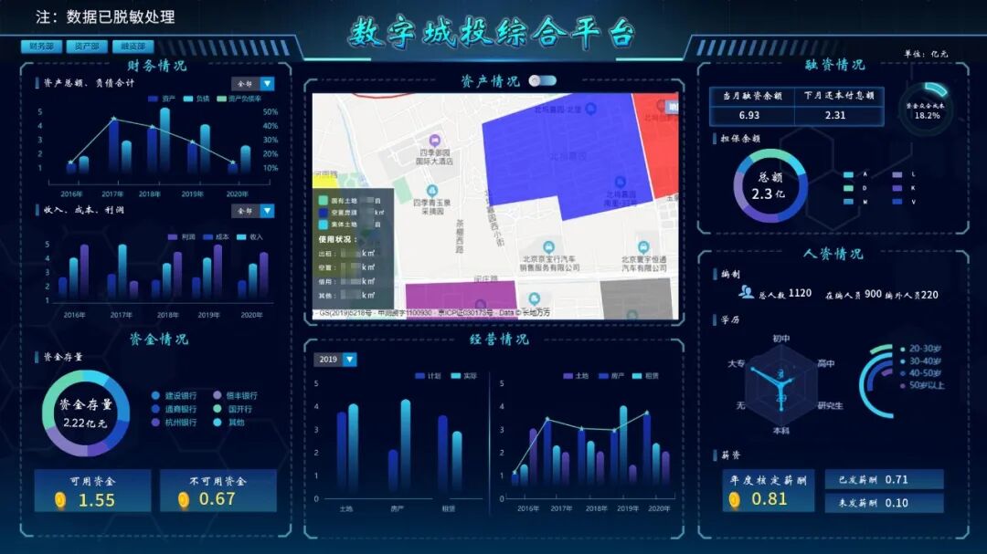 借助数据应用服务为城投企业搭建数字城投综合平台,将企业的财务、资金、资产、经营、融资及人力资源等情况直观反馈给管理层,辅助企业管理者一屏掌控经营全貌,快速定位异常情况,推动管控数字化,提高企业管理的精细度和深度。