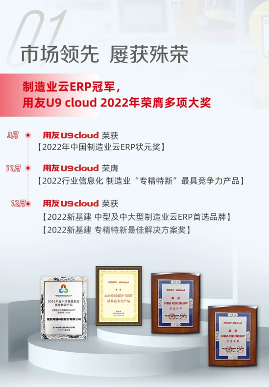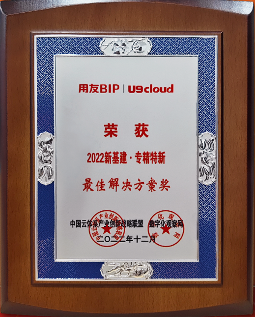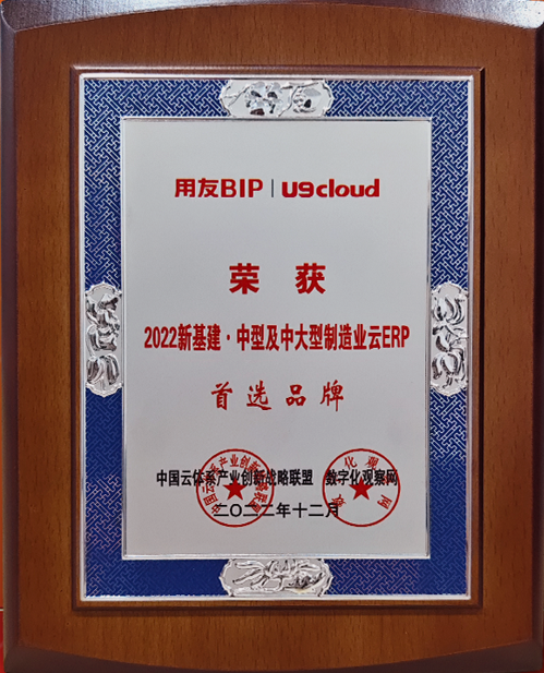 用友U9 cloud荣获“2022新基建·中型及中大型制造业云ERP首选品牌”及“2022新基建·专精特新最佳解决方案奖”两项殊荣。(中国云体系产业创新战略联盟、数字化观察网)