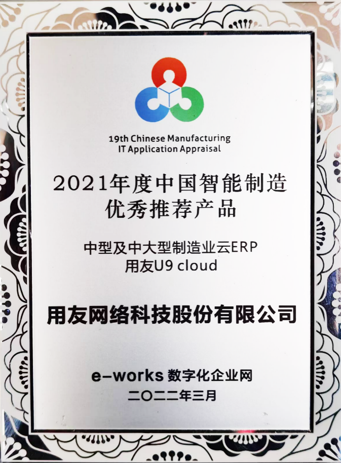 用友U9 cloud荣获“2021中国智能制造优秀推荐产品”(e-works 数字化企业网)