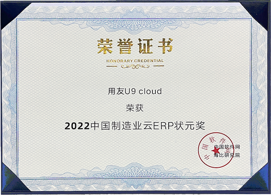 用友U9 cloud荣获“2022中国制造业云ERP状元奖”(中国软件网、海比研究院)