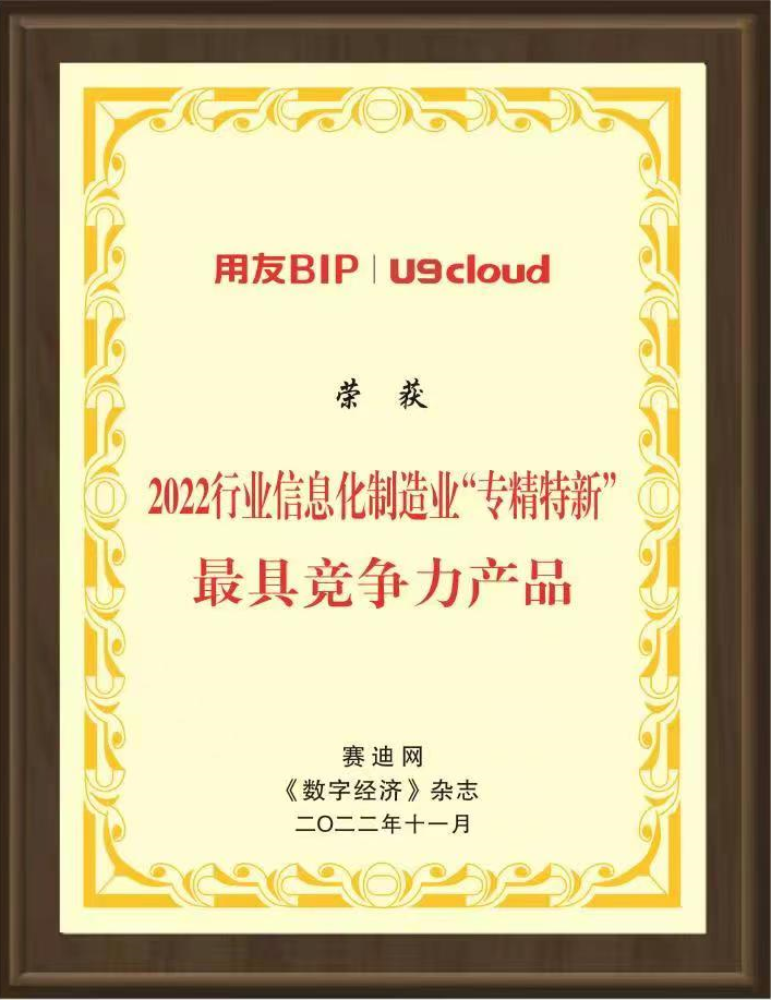 用友U9 cloud荣获“2022“专精特新”最具竞争力产品”奖(赛迪网、《数字经济》)
