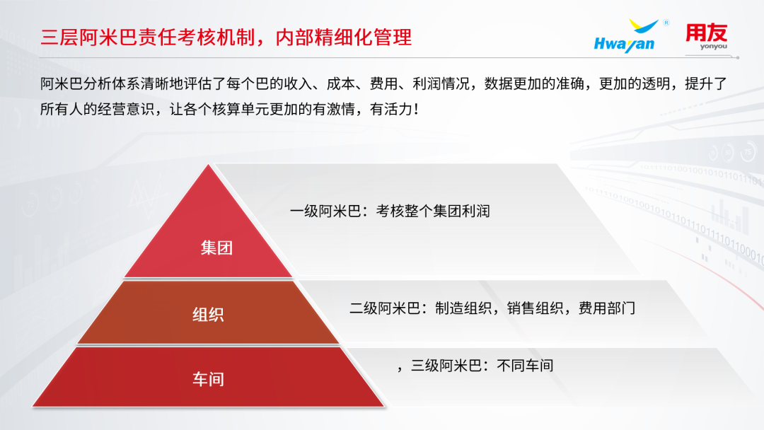 华燕船舶一直采用的是内部阿米巴经营核算,过去都是通过经营核算小组手工核算,随着企业规模变大、组织变多,如何发挥员工积极性并客观的评价工作结果,U9 cloud数据应用服务很好的解决了这个问题,在原有核算组织和部门的基础上,构建了从集团到组织到车间的三层阿米巴责任考核体系: