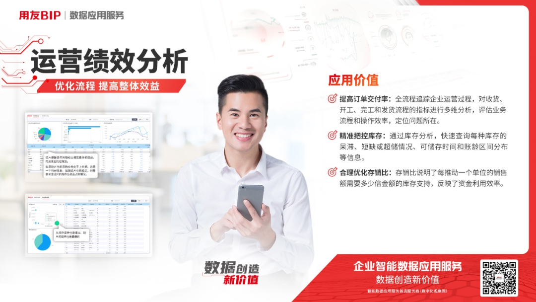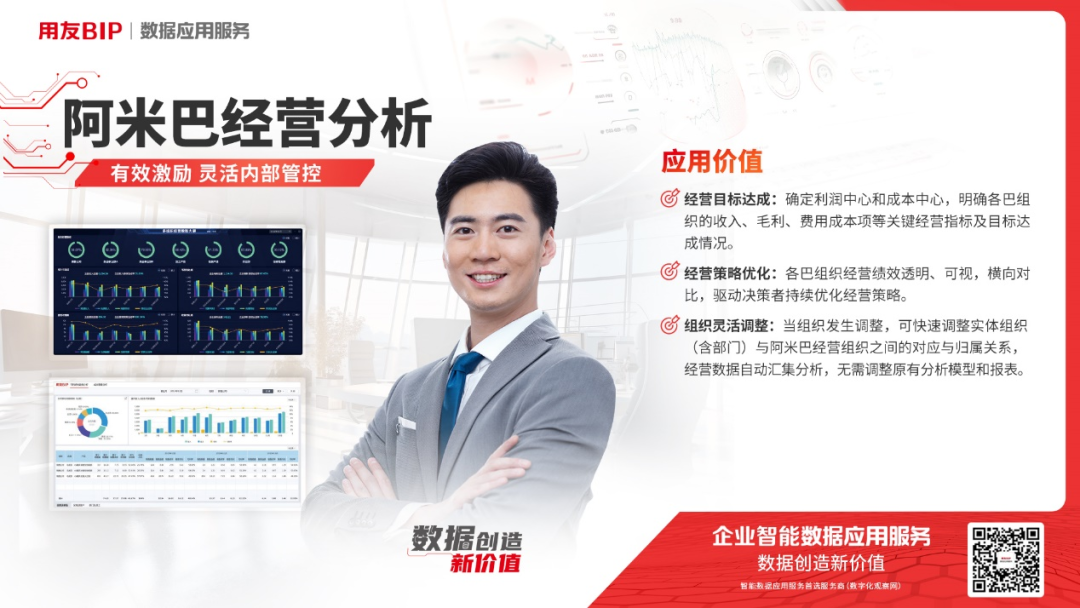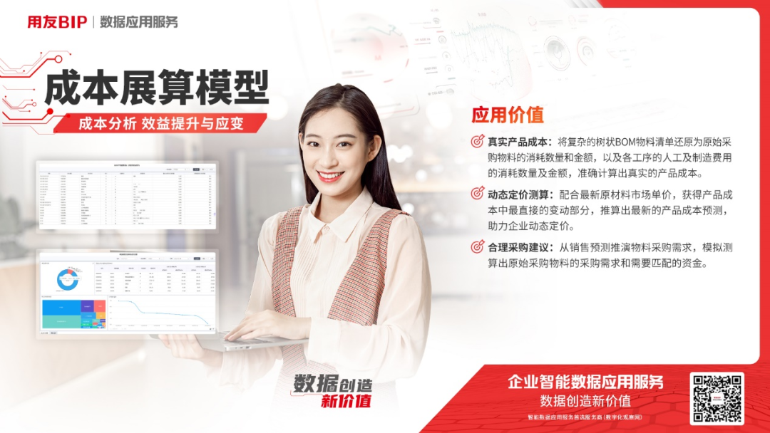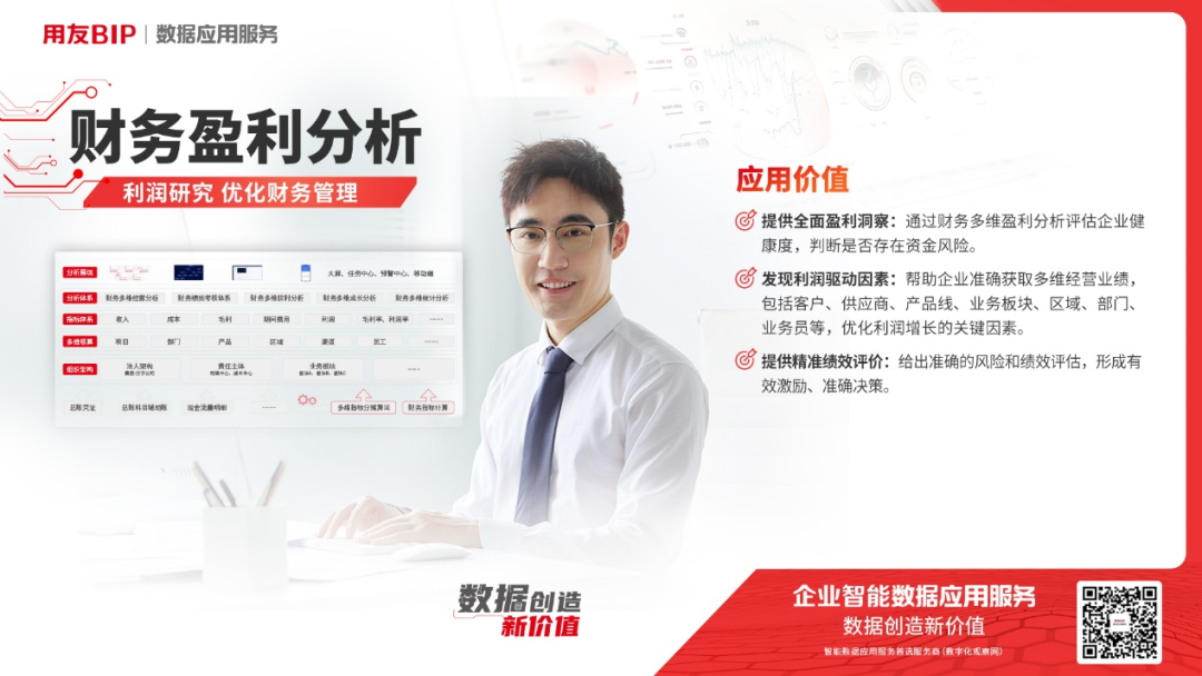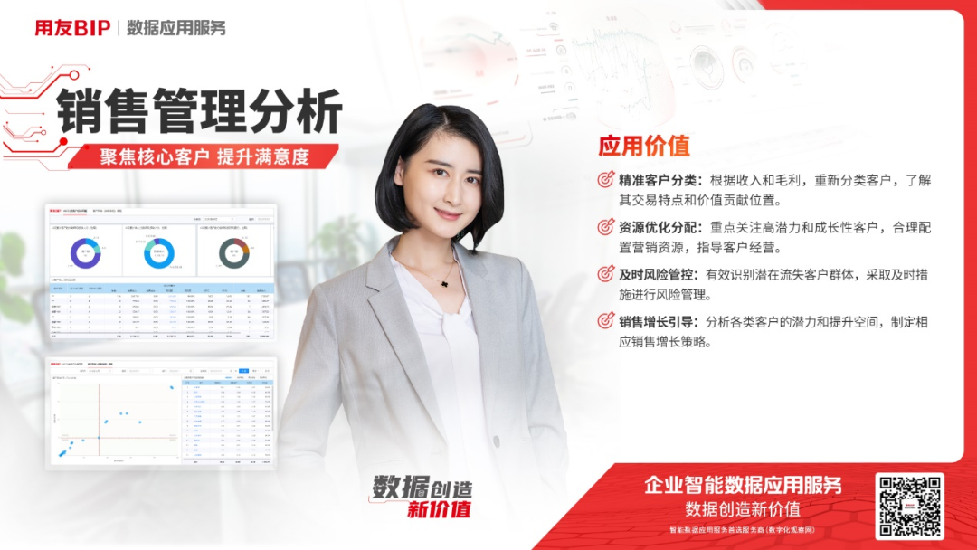 用友数据应用服务利用大数据、云计算、AI 等技术连接 ERP 及其他系统的各项业务、流程、管理及运营等,帮助企业消除数据孤岛、拉通全业务数据。同时针对不同行业、不同管理场景提供了丰富的主题模型,更贴合管理者的经营诉求,为收款难、签约难、客户流失、项目利润不清晰等难题提供标准化产品解决方案,为企业提供智能化决策支持。
