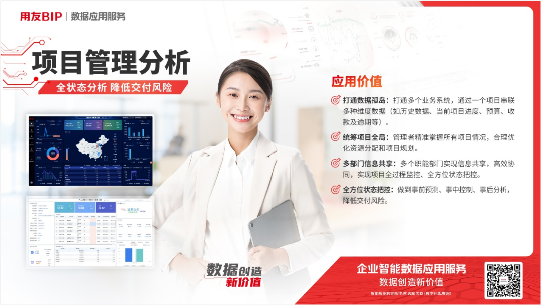 用友数据应用服务打通多个业务系统,包括协同、财务、供应链、生产、设计、MES 等,通过一个项目串联多种维度数据,包括项目历史数据、当前项目进度、预算实际对比、收款计划跟踪以及逾期预测等,助力各级领导关注一条线(项目全过程监控)、一个面(项目全方位状态),实现数据一体化应用。