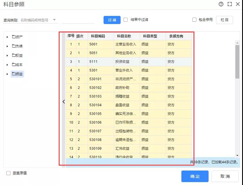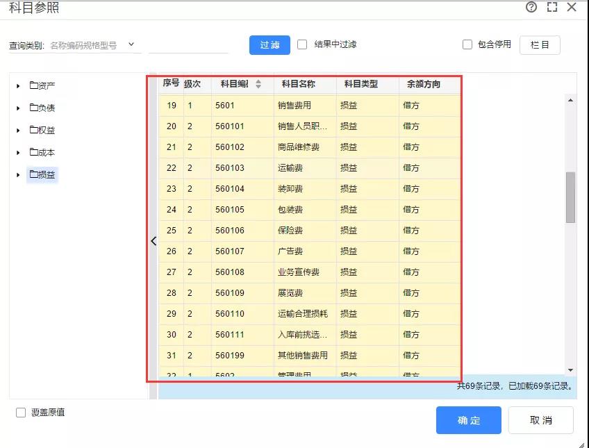 如果费用类科目太多,但是在一个区间内都属于费用类科目,此时可以选中排序为第一个的费用类科目,然后拖动滚动条至最后一个费用类科目,按住键盘的SHIFT键后选中最后一个科目,可以实现一次性选中区间内全部科目,最后点击【确定】进行查询。