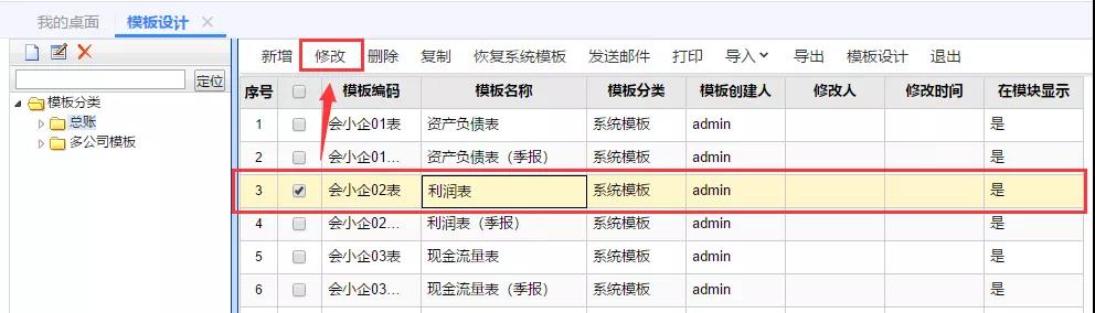 第2步:确认取值错误科目后,依次点击【T-UFO】-【模板设计】,选择【利润表】点击修改。