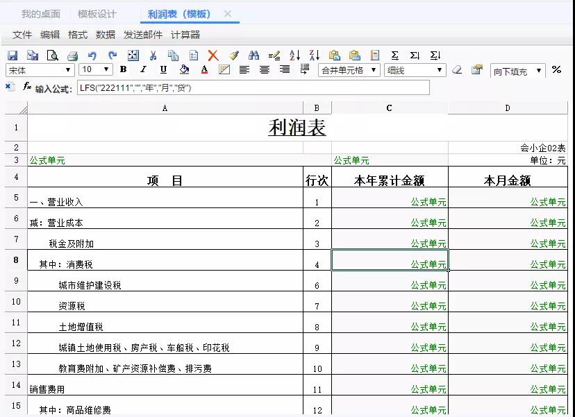 第3步:进入利润表模板设计界面,查看错误取值科目的公式设置,注意公式中的取值函数及取值方向是否有问题,可根据实际需要修改取值公式,然后重新进入报表数据取数