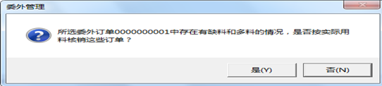 核销时,如果订单对应的出库单未核销数量和按用户选择的核销方式计算的标准用料之间有差异,系统会在核销时进行检查,并提示用户两者有差异,是否按实际用料进行核销,如果选择是则按出库单的未核销数量核销,如果选择否,则取消核销操作。